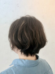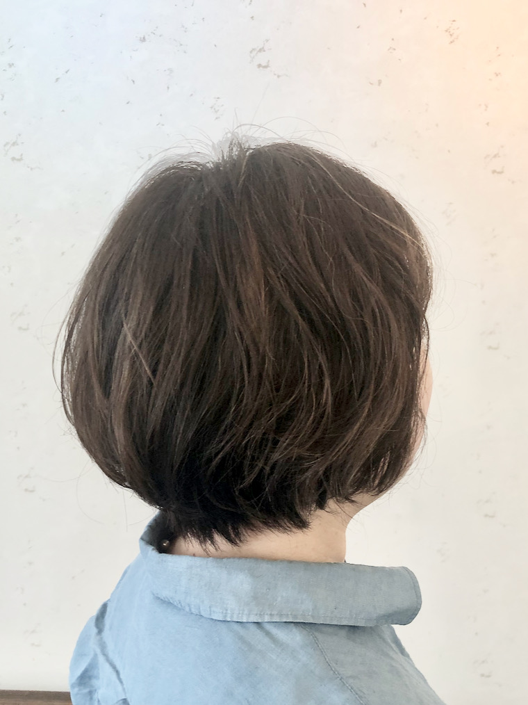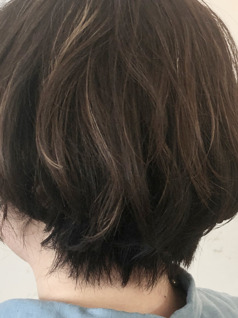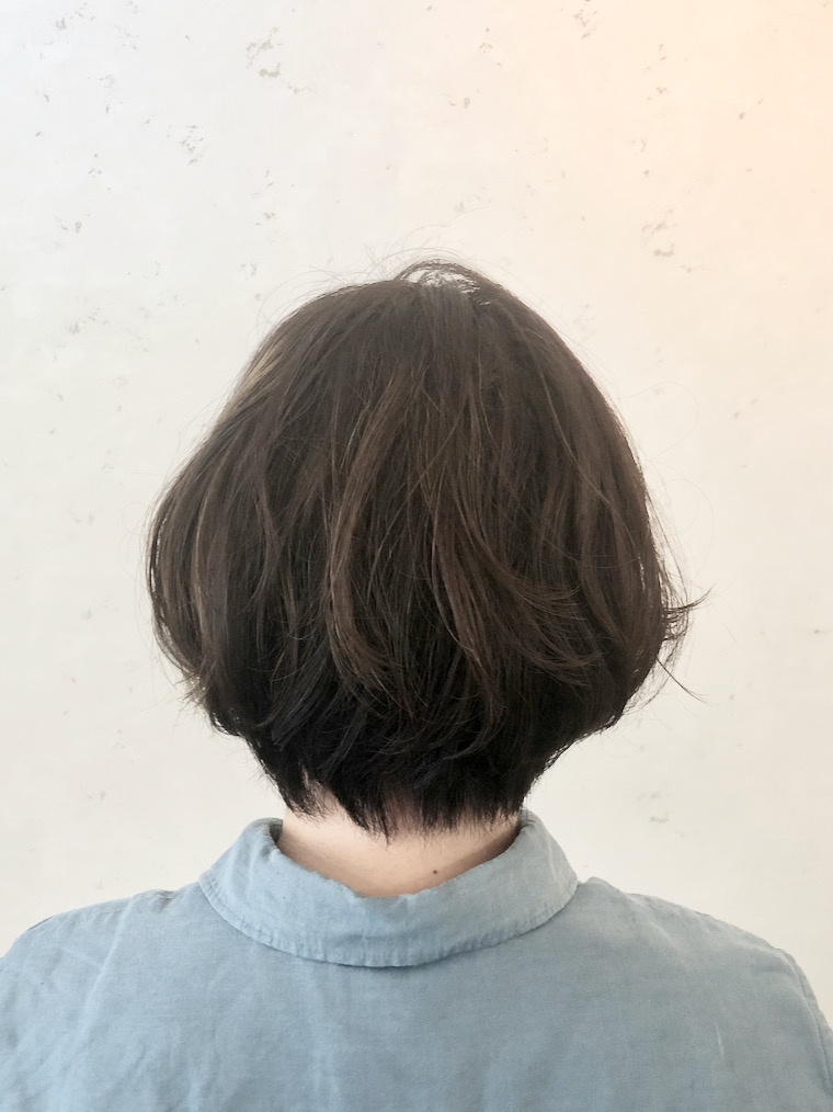NameShort カンタンスタイリングのゆるパーマDataShortパーマ + ワンメイク・カラーPointベース・カットはグラデーション・ボブ。頭の形に合わせて最小限にレイヤーを入れる。パーマはお手入れ楽チンなゆるいカール。カラーは顔まわりのグレーをカバー+ウィービング・ハイライトを落ち着かせるワンメイク。 ヘアクリームでベースを整え、セット力の弱いワックスでナチュラルに仕上げる。