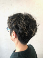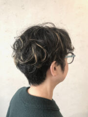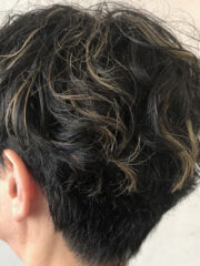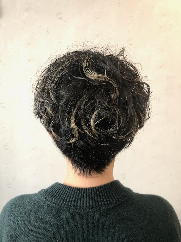 NameShort クセ毛を活かすウィービング・ハイライトDataShortウィービング・ハイライト + ツーブロックカットPoint全体に不規則なクセ毛、太さは普通で量は多め。ハチから下を甘めのツーブロックにカット。太めのウィービングでランダムにブリーチした後、トナーシャンプーで少しくすませる。 仕上げ ウエットな状態でラデュラオイルセラムをたっぷり塗布しディフューザーでドライ、クセ毛を活かしてラフに仕上げる。