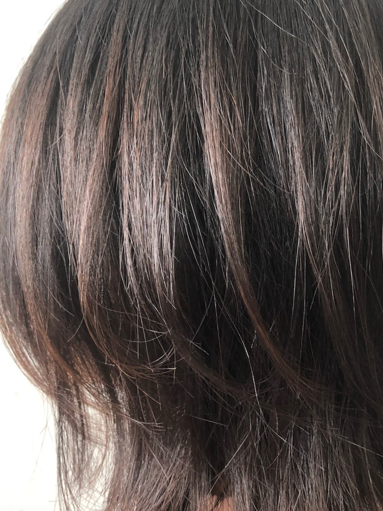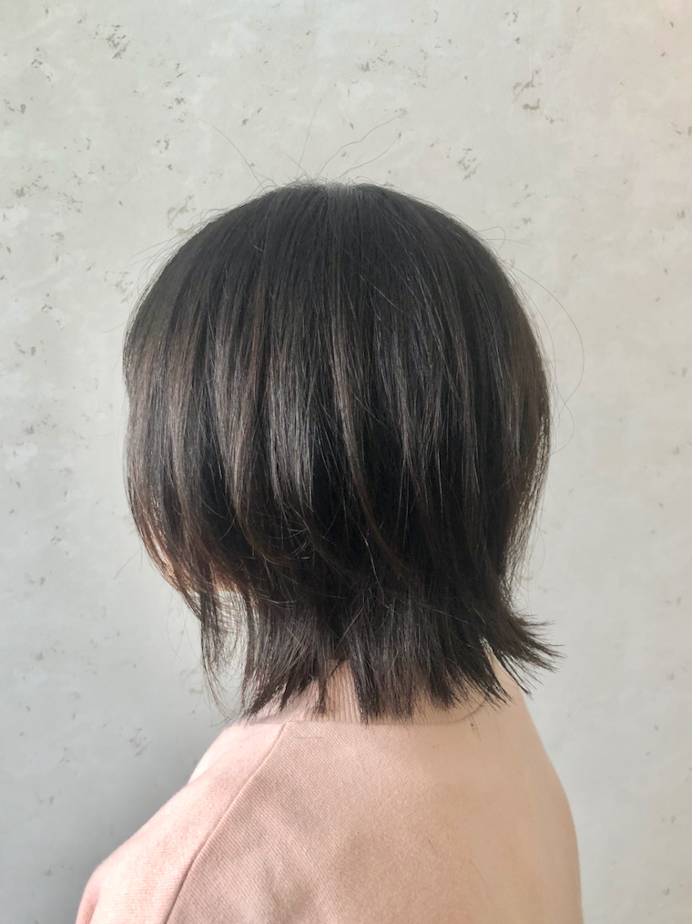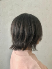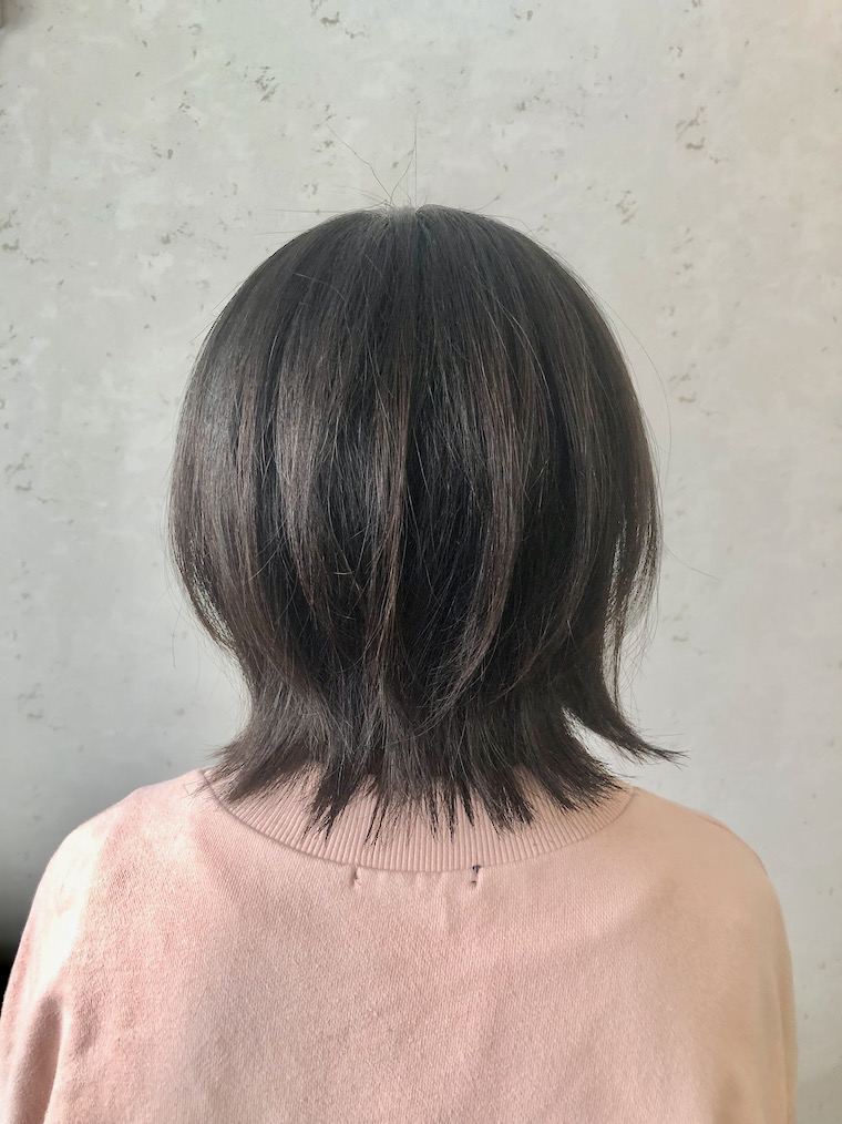 NameShort ショートボブの外ハネスタイルDataShort表面に少しだけグラデーションをつけたカットPoint後頭部の量が多く、少しクセ毛。髪の太さはやや太め。表面に少しだけグラデーションをつけたボブ。後頭部はしっかり量を取って軽くする。 仕上げ しっかりハンドブローした後、ストレートアイロンでアウトラインを外ハネに、表面は軽く立ち上がる程度にスルーする。オイルを使い空気感を出す。