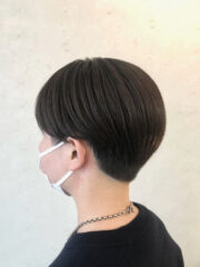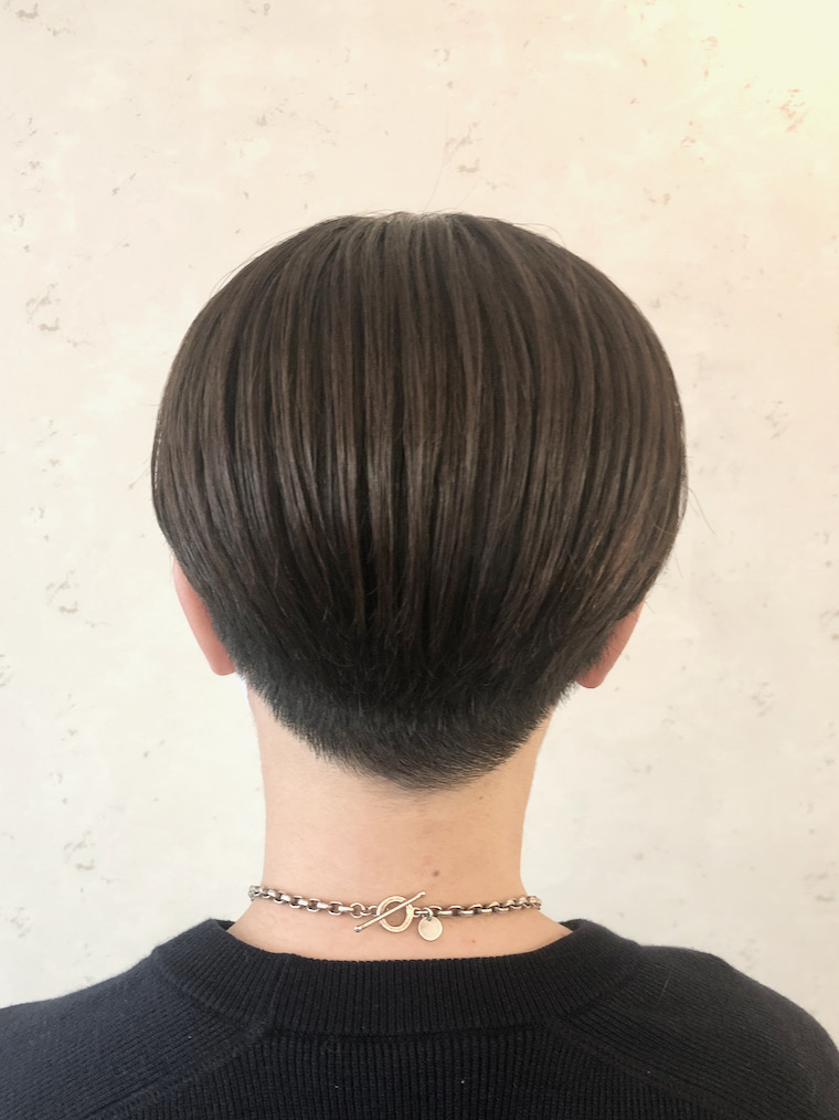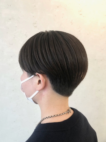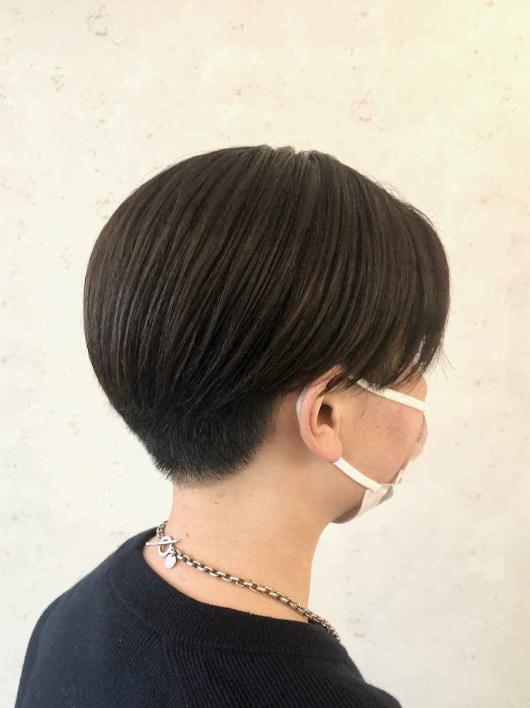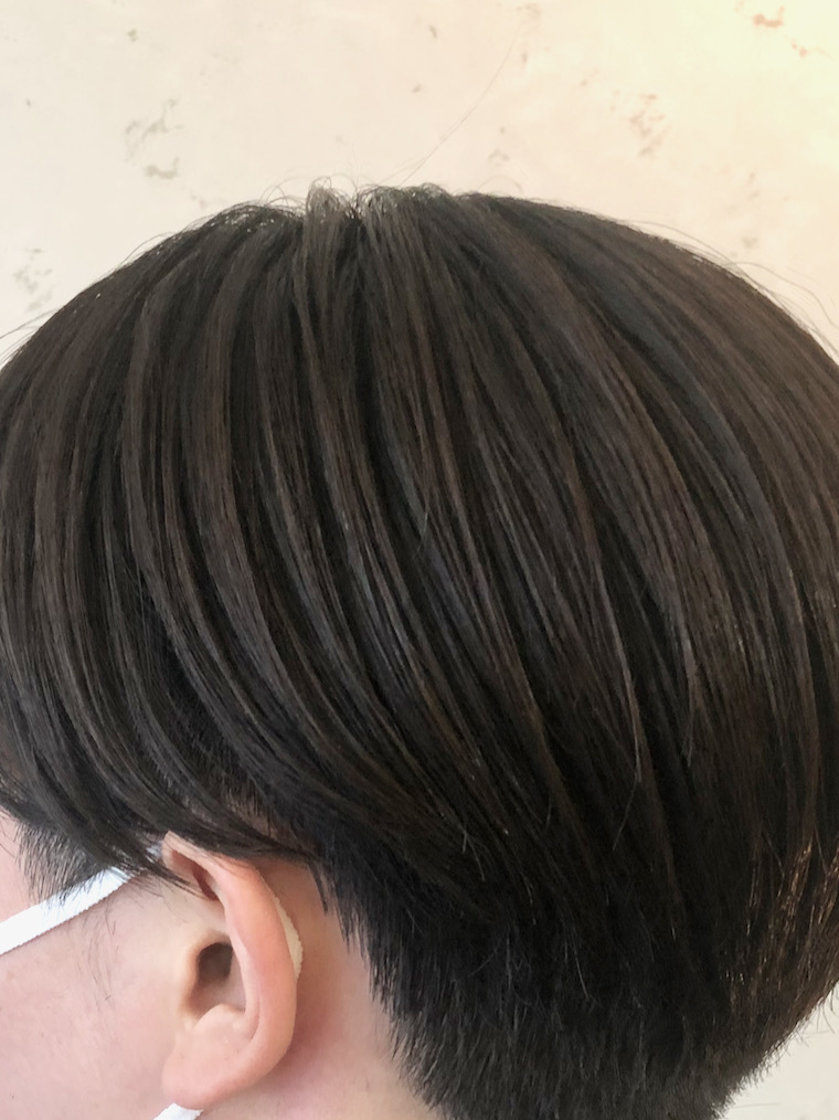 - しっかりした髪質で量は多め、黒染めの履歴がある、ややダメージ毛。サイドの内側は1cmくらいのツーブロック。バックはつなげてカットしている。ツヤ感を失わないようセニング(すきばさみ)を使わずスライドカットで毛量を減らす。