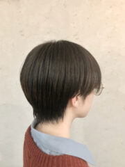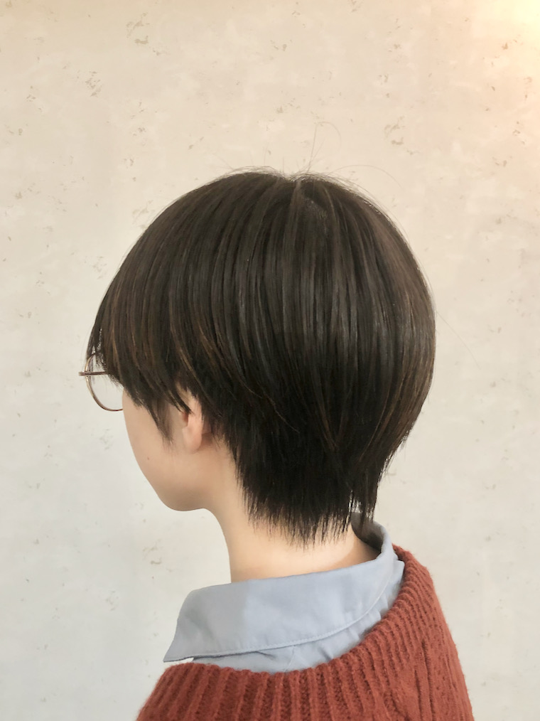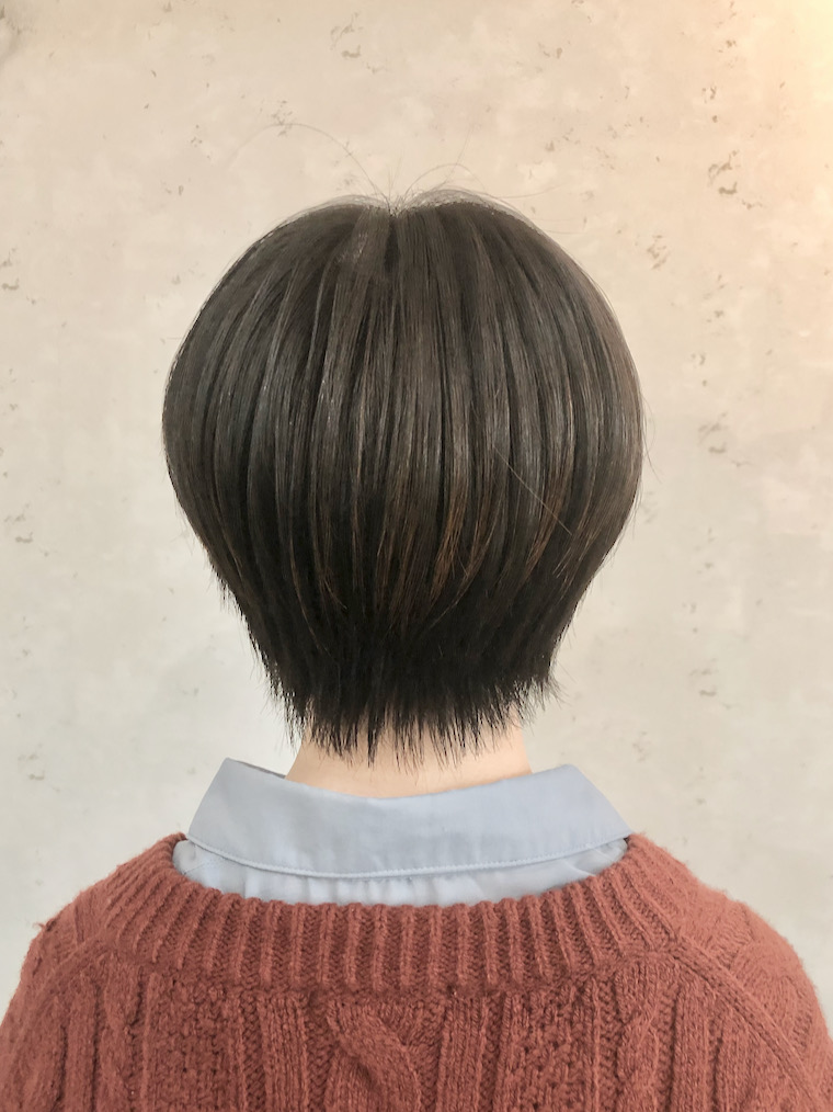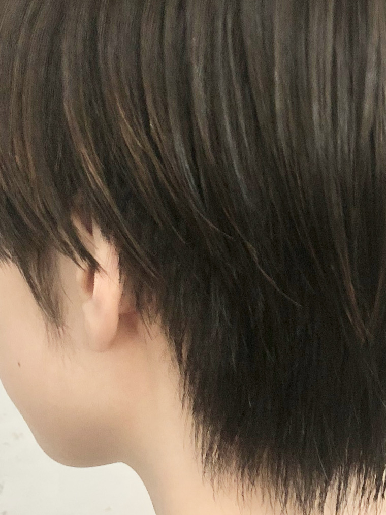 NameShort メンズライクなツーブロック・カットDataShortツー・ブロック・カットPointサイドは甘めの刈り上げ、バックは襟足とつなげてカットする。毛量が多いので、フォルムを崩さないようにしっかり量を取る。 しっかりハンドブローで乾かし毛先に緩めのアールをつける。ミストオイルを全体に薄くスプレーし粗めのコームで整える。